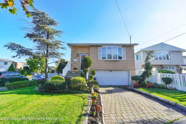 Welcome to this one family detached home in Eltingville. Centrally located and convenient to all amenities: shopping, transit, buses, houses of worship, schools and parks. This corner property raised ranch style home comes with an oversized garage and a manicured lawn with pavers as well as grassy areas for outdoor entertaining and fun.The home offers 3 bedrooms, one and a half baths, large living room with connected dining room, and an eat in kitchen complete with granite countertops. Hard wood flooring throughout which has been preserved under carpeting. Large attic for maximum storage. The lower level offers additional living space currently being used as a large family room as well as an additional room for guests or as needed. This home is a must see and with some updating will be great place to come home to!